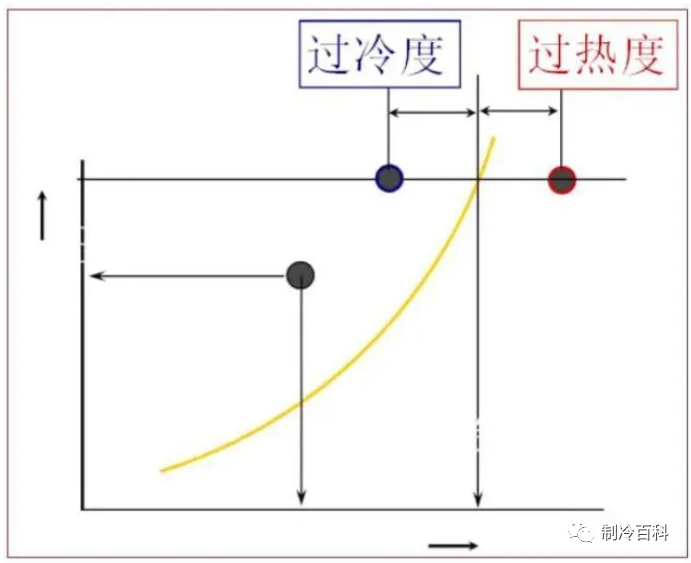 過冷度的定義:冷凝器冷凝壓力對應的飽和液體溫度和冷凝器出口液體實際溫度的差值。 工程上,一般將排氣壓力近似看作冷凝壓力,排氣壓力對應的飽和液體溫度和冷凝器出口液體的溫度之差,作為過冷度。之所以這樣近似,是因為冷凝器的壓降相對于蒸發器而言較小。對于風冷冷凝器,3~5度的過冷度比較合適。制冷系統正常循環時,冷凝器的出口一般都會有一定的過冷度。吸氣如果完全無過熱度,就有可能產生回氣帶液,甚至引起濕沖程液擊損壞壓縮機。為了避免此種現象,就需要一定的吸氣過熱度,以保證只有干蒸汽進入壓縮機。過熱度太高也有缺點,過熱度偏高會引起壓縮機排氣溫度(排氣過熱度)升高,壓縮機運行工況惡化壽命降低。所以,吸氣過熱度應該控制在一定范圍之內。